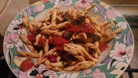 450 gr. di pasta fresca tipo trofie, 4 funghi porcini, 400 gr. di pomodori datterini, 2 spicchi d'aglio, 4 cucchiai olio di oliva, sale, prezzemolo.